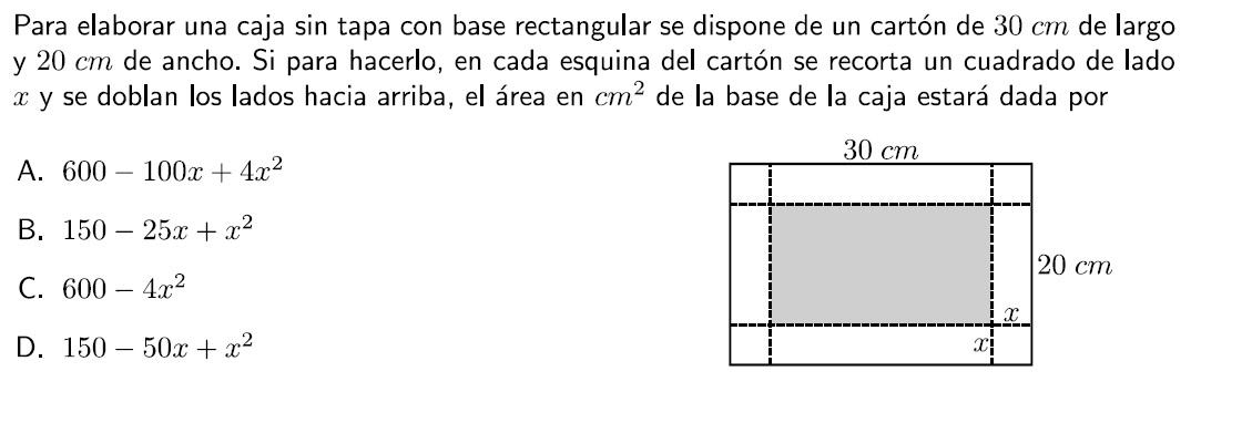 la respuesta es la A porque el area total es 600cm cuadrados en tonces hay que restarle el area sobrante, es decir las 4 esquinas y los rectangulos adyacentes..
